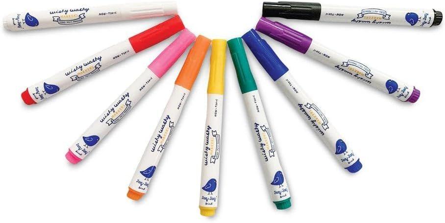 Die Wishy Washy Malstifte eignen sich für glatte Oberflächen wie Fenster, Gläser oder Tassen und vor allem für die von Jaq Jaq Bird kreierten Kreidemalbücher und Matten.