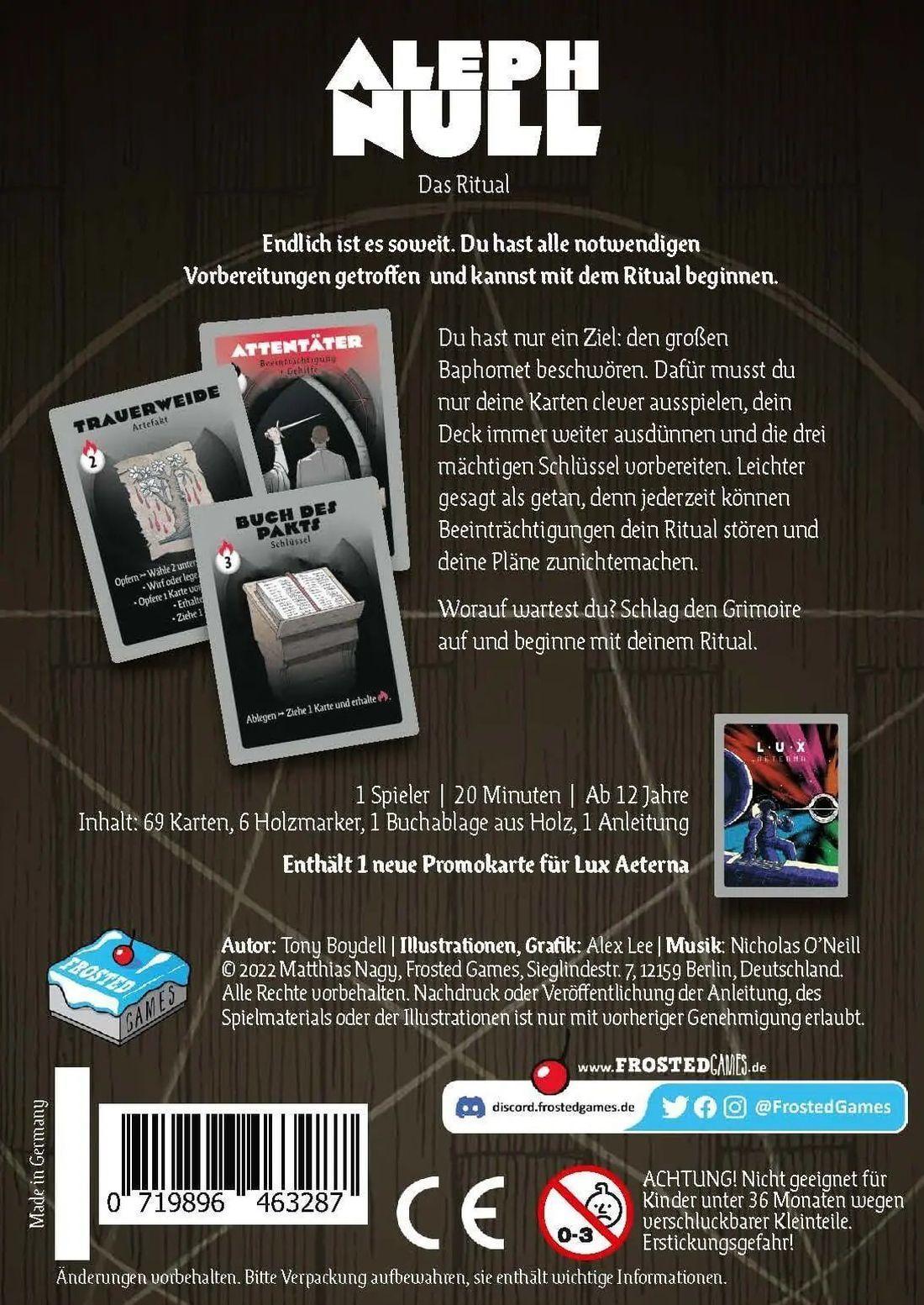 Aleph Null ist ein ein dämonisch gutes Solo-Spiel von Tony Boydell mit Illustrationen von Alex Lee ab 12 Jahren. Entferne möglichst viele Karten aus deinem Deck und beschwöre den Dämon Baphomet.