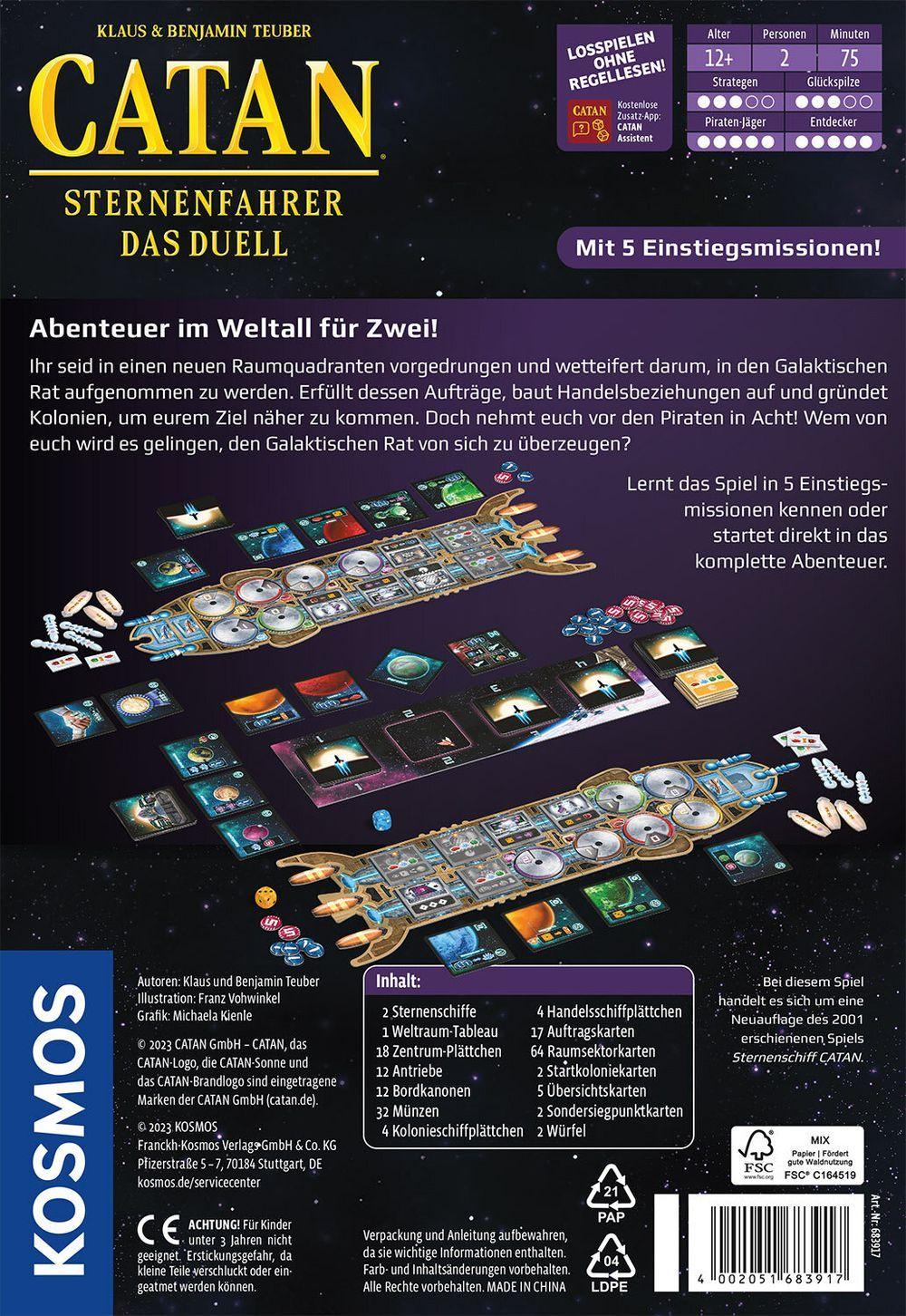 Wer findet die richtige Strategie, erfüllt die unterschiedlichen Missionen und überwindet die Piraten? Der Einstieg in das Spiel gelingt leicht mit fünf Lernmissionen. Durch die dynamischen Kartenstapel verläuft jedes Spiel anders und bietet neue Herausforderungen! Die umfangreich überarbeitete Neuauflage des beliebten Abenteuers CATAN – Sternenschiff für zwei Personen ab 12 Jahren.
