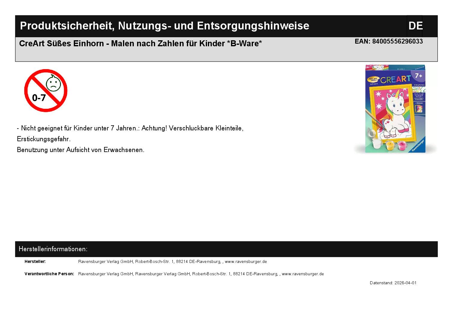 Produktinformationen "CreArt Süßes Einhorn - Malen nach Zahlen für Kinder *B-Ware*"