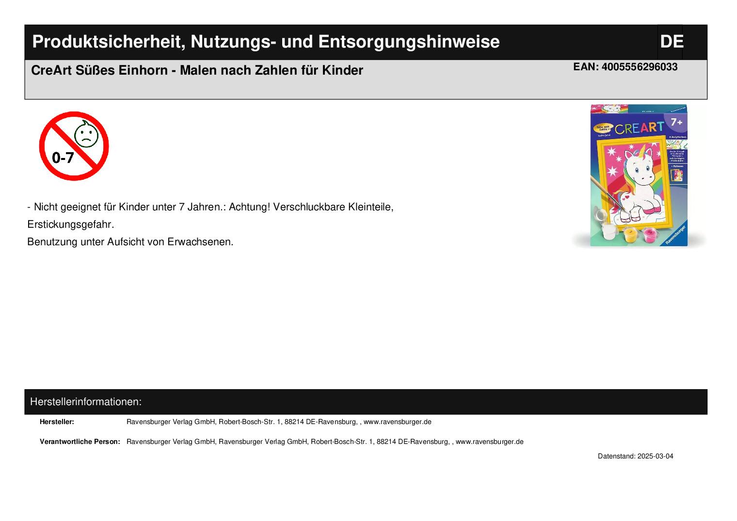 Nicht geeignet für Kinder unter 7 Jahren. Benutzung unter Aufsicht von Erwachsenen. Anweisung vor Gebrauch lesen, befolgen und nachschlagebereit halten. Die Farben enthalten Reaktionsmasse aus 5-Chlor-2- methyl-2H-isothiazol-3-on und 2-Methyl-2H-isothiazol-3-on (3:1) Kann allergische Reaktionen hervorrufen.