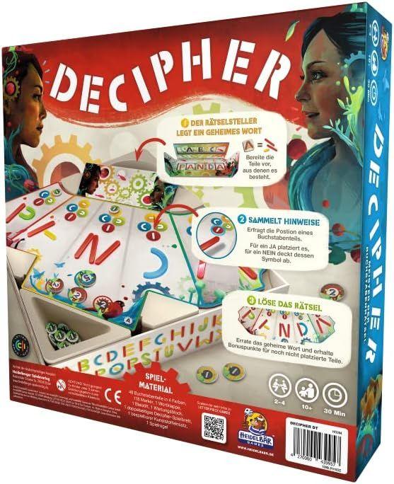 Decipher ist ein ganz besonderes Wörter-Deduktionsspiel für 2 - 4 Spieler. Ihr benutzt Buchstabenteile in vier verschiedenen Formen, um Wörter zu bauen und zu erraten.