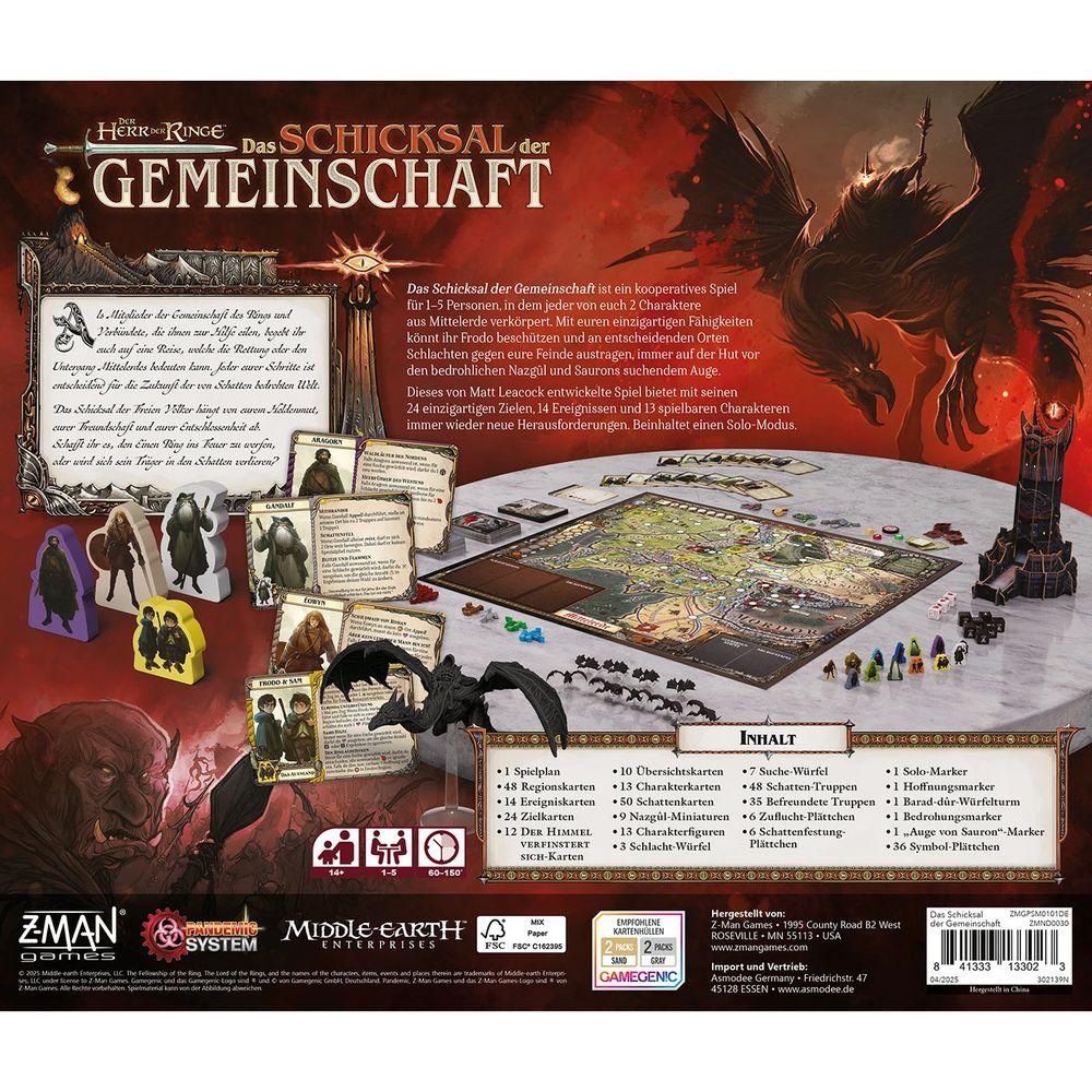 Der Herr der Ringe: Das Schicksal der Gemeinschaft ist ein kooperatives Spiel für 1–5 Personen, in dem jeder von euch 2 Charaktere aus Mittelerde verkörpert. Mit euren einzigartigen Fähigkeiten könnt ihr Frodo beschützen und an entscheidenden Orten Schlachten gegen eure Feinde austragen, immer auf der Hut vor den bedrohlichen Nazgûl und Saurons suchendem Auge.
