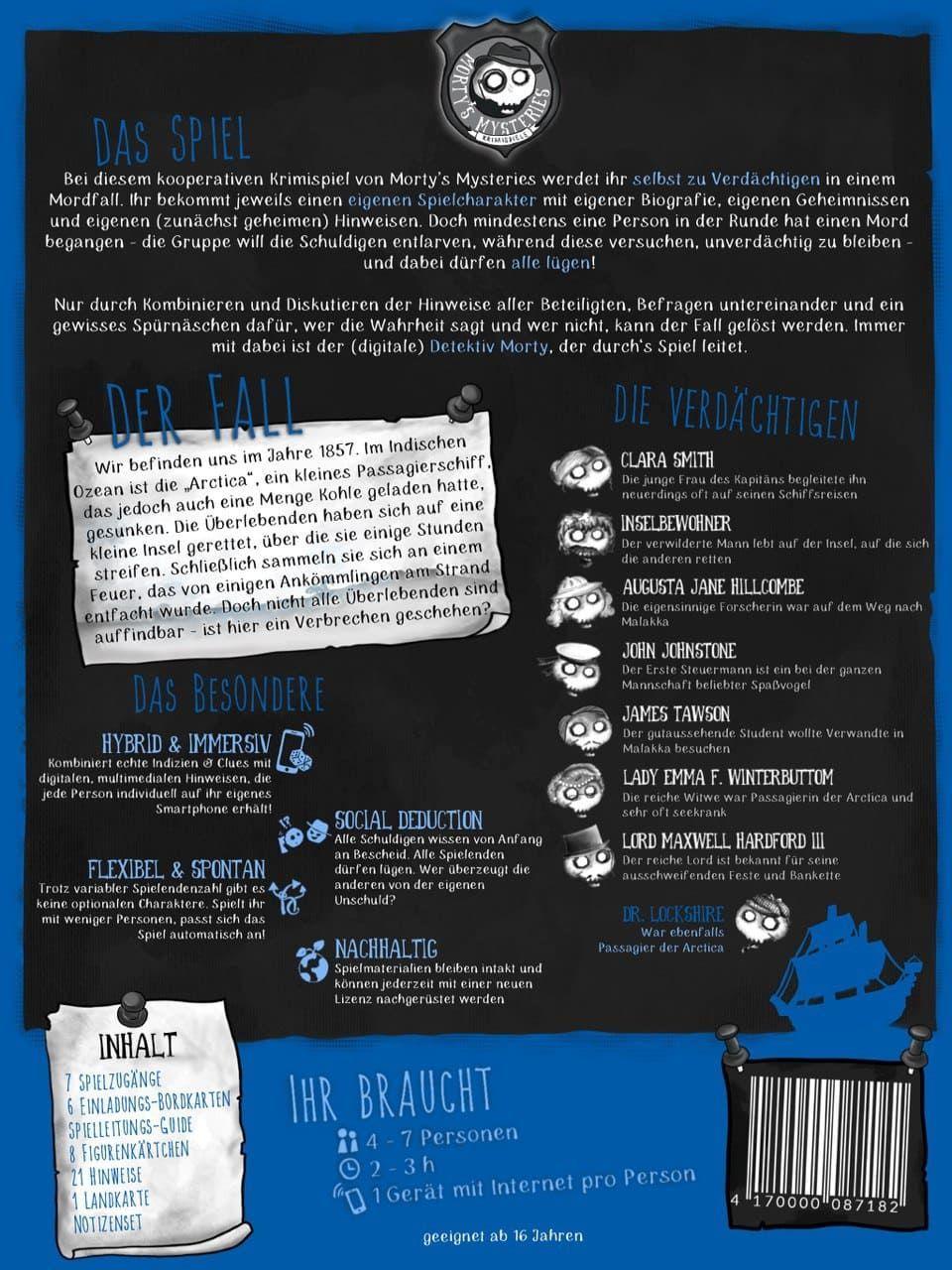 Schlüpft in die Rolle der Verdächtigen Überlebenden und findet heraus, wer unter euch sich eines Verbrechens schuldig gemacht hat. Entdeckt gemeinsam mit Detektiv Morty (der die Rolle von Dr. Lockshire übernimmt), welche dunklen Geheimnisse eure Mitreisenden zu verbergen haben und vor allem – wer unter euch lügt!