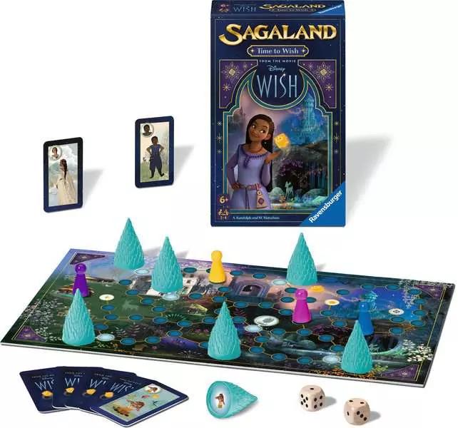 Bei Disney Wish Sagaland, im kompakten Reiseformat, tauchen die Spieler in das Königreich Rosas aus dem Walt Disney Film Wish ein. Die beliebtesten Charaktere wie Asha, Valentino, Dahlia und viele weitere müssen in Rosas gefunden werden. Ziel der 2-4 Spieler ist es zu wissen, unter welchem Baum sich der gesuchte Charakter verbirgt. Wer das Versteck als Erstes richtig aufdeckt, gewinnt eine Karte. Wer am Ende die meisten Karten gewonnen hat, gewinnt auch das Spiel.