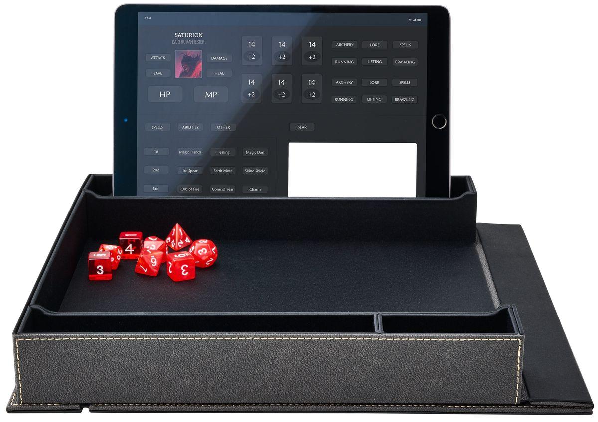 Do you use digital character sheets on a mobile phone or tablet? Use the included foam blocks and place it in the miniature compartment to rest at the perfect viewing angle while playing. The Companion can be folded if table space is tight.