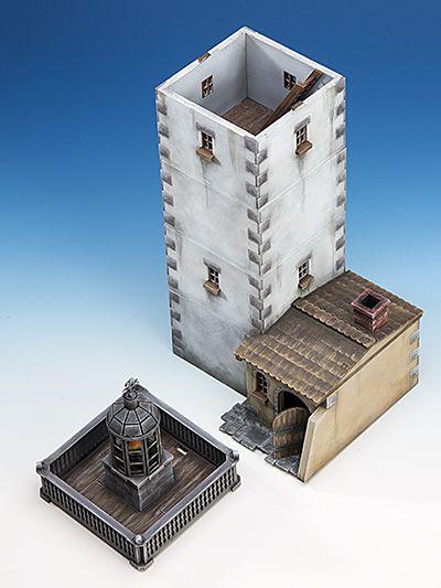 Der Leuchtturm steht am Rande des Hafens und überragt die Gebäude der Stadt um Längen. Er trägt sein Licht weit über den Ozean und leitet die Schiffe bei Nacht in die Sicherheit des Hafens… obwohl es schon vorgekommen sein soll, dass listige Piraten das Leuchtfeuer etwas umgeleitet haben. Ein vier Stockwerke hoher Turm mit einem filigranen Leuchtfeuer. Angebaut an dem Turm ist das Haus des Leuchtturmwärters. Die Stockwerke sind abnehmbar und können variabel aufgesetzt werden. Der Leuchtturm hat eine Grundfläche von etwa 17 x 12 cm und eine Höhe von 29 cm und ist damit das höchste Gebäude unserer Serie. Mehrteiliger, unbemalter Lasercut-HDF-Bausatz im 28mm Maßstab, der noch zusammengebaut werden muss. Eventuell abgebildete Figuren sind nicht enthalten und dienen nur dem Größenvergleich. Farben und Klebstoff nicht enthalten. Entwickelt von Werner Klocke in Zusammenarbeit mit Micro Art Studio.