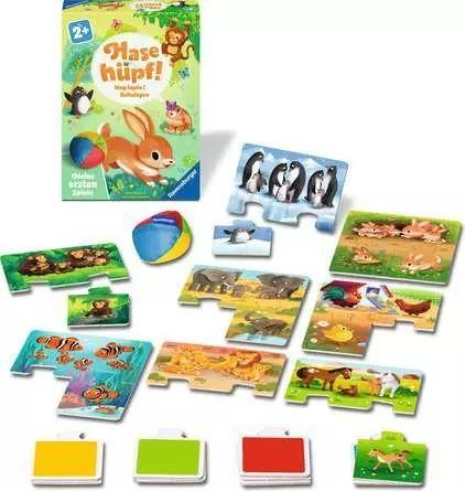 Im Kinderspiel "Hase hüpf!" stellen sich die Kleinen Fragen wie: Wo wohnt der Hase? Wann haben wir den schon mal gestreichelt? Wie bewegt er sich? Im Freispiel besprechen die Kinder angeregt durch die illustrierten Puzzlekarten acht unterschiedliche Tierarten und ahmen sie in Lauten und Bewegung nach. Anschließend versuchen sie, die Puzzleteile wieder zusammenzulegen. Sie greifen und begreifen. Mit dem Farbball und den Kartenrückseiten lernen die Kinder einzelne Farben kennen und unterscheiden.