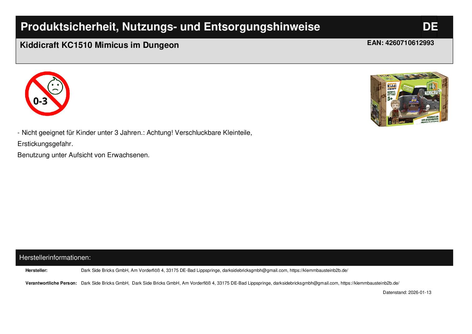 Dark Side Bricks GmbH Am Vorderflöß 4 33175 Bad Lippspringe darksidebricksgmbh@gmail.com https://klemmbausteinb2b.de/ WEEE-Nummer: