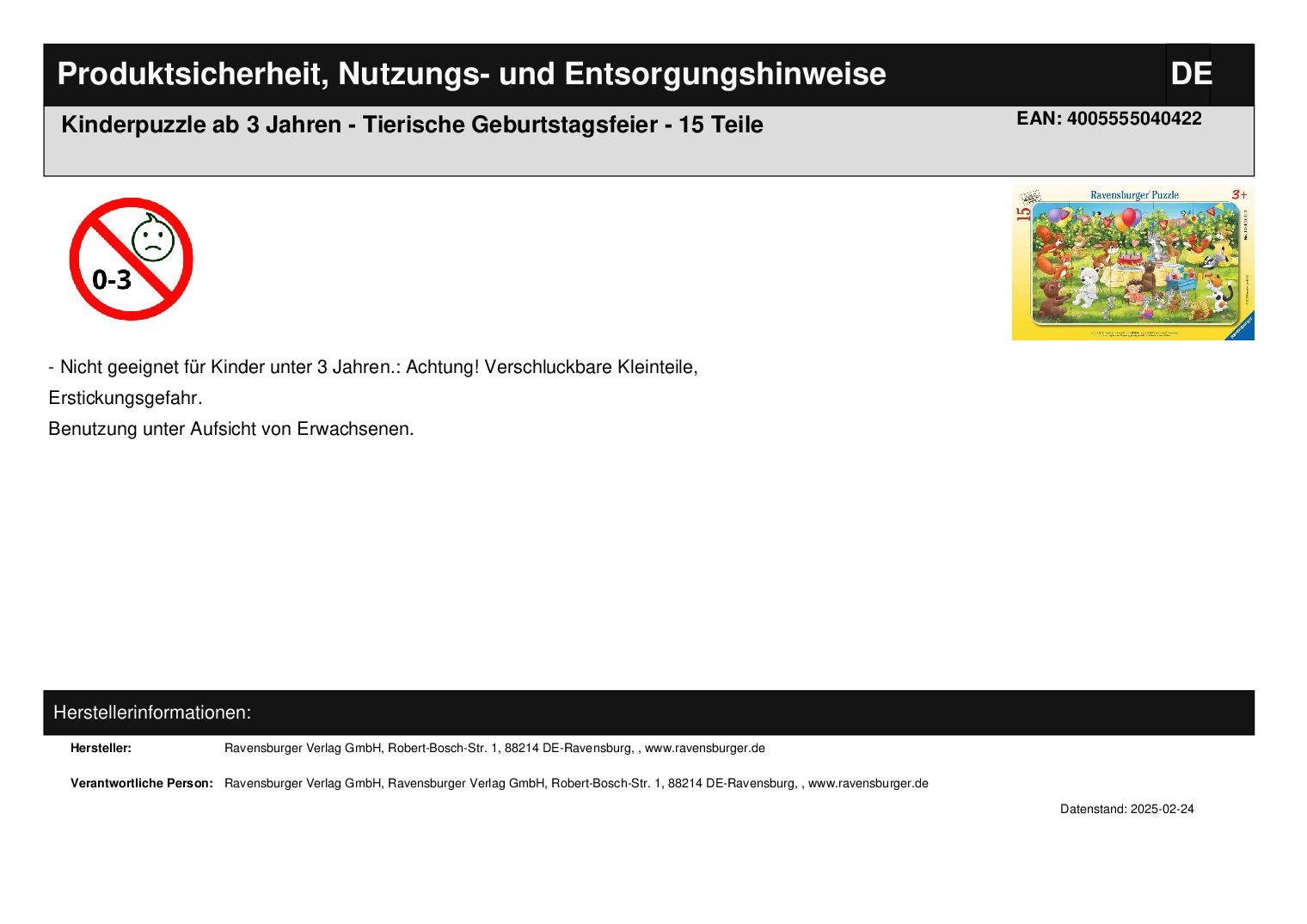 Die Unbedenklichkeit aller verwendeten Materialien wird von einem unabhängigen Institut bestätigt. Seit mehr als 100 Jahren entwickeln wir Puzzles, wie Kinder sie lieben: altersgerecht in Motiv, Teilezahl und -größe.