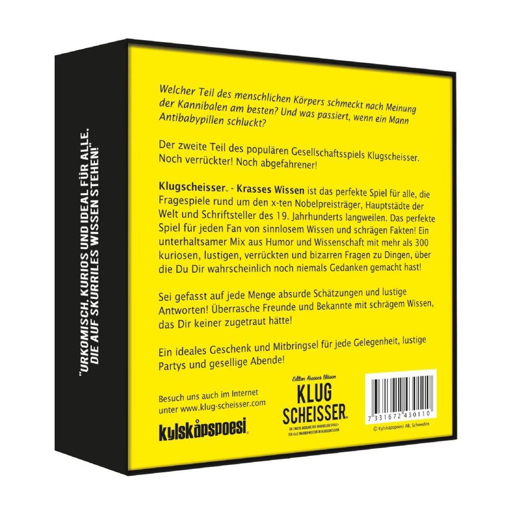 Klugscheisser - Black Edition ist das perfekte Spiel für alle, die Fragespiele rund um den x-ten Nobelpreisträger, Hauptstädte der Welt und Schriftsteller des 19. Jahrhunderts langweilen. Das perfekte Spiel für jeden Fan von sinnlosem Wissen und schrägen Fakten!Ein unterhaltsamer Mix aus Humor und Wissenschaft mit mehr als 300 kuriosen, lustigen, verrückten und bizarren Fragen zu Dingen, über die Du Dir wahrscheinlich noch niemals Gedanken gemacht hast!