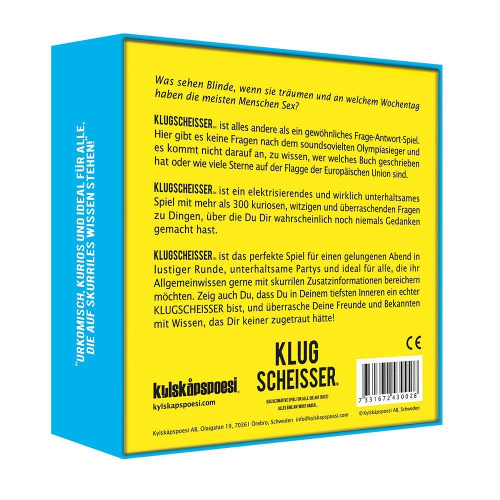 Klugscheisser ist ein elektrisierendes und wirklich unterhaltsames Spiel mit mehr als 300 kuriosen, witzigen und überraschenden Fragen zu Dingen, über die Du Dir wahrscheinlich noch niemals Gedanken gemacht hast.