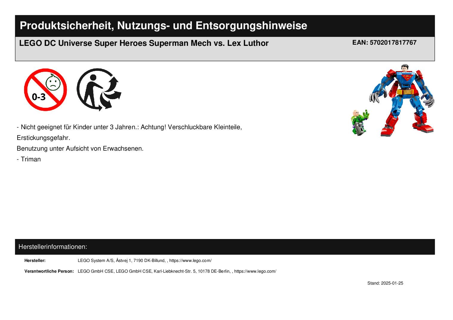 Dieses LEGO DC Superman-Spielset beinhaltet 2 Minifiguren: Superman mit Stoffumhang und umdrehbarem Kopf (mit 2 unterschiedlichen Gesichtsausdrücken) sowie Lex Luthor mit Shooter und Kryptonit-Kristall. Der baubare Mech kann Arme, Beine und Finger bewegen. Klappt man den Oberkörper auf, kann man Superman ins Minifigur-Cockpit stecken. Am Rücken des Mechs befinden sich 2 verstellbare Schubdüsen, die den Mech „fliegen“ lassen. Zusätzlichen digitalen Bauspaß bietet die intuitive LEGO Builder App. In der App können Baumeister 3D-Modellansichten vergrößern und drehen sowie ihren Baufortschritt verfolgen.