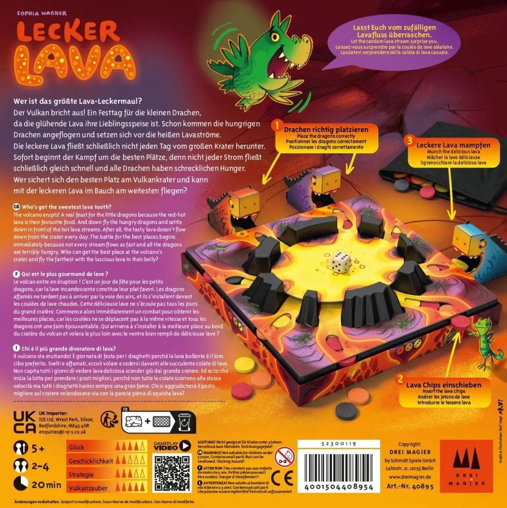 Schiebt Lavachips clever in die Lavaströme und sichert euch die besten Plätze vor den Vulkanöffnungen, so dass euer Drache am Ende mit der leckersten Lava im Bauch am weitesten fliegen kann. Wer gewinnt dieses drachenstarke Vulkanspiel?