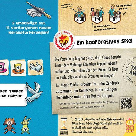 Magic Rabbit ist ein schnelles Spiel für 1 bis 4 Personen ab 8 Jahren, bei dem ihr unter Zeitdruck zusammenarbeiten müsst, um Hasen und Hüte in die richtige Reihenfolge zu bringen.
