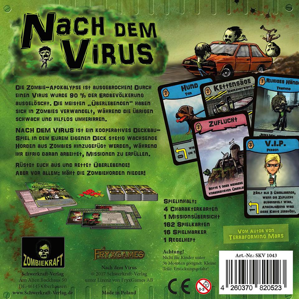 Nach dem Virus ist ein kooperatives Deckbau-Spiel in dem Eurem eigenen Deck stetig wachsende Horden aus Zombies hinzugefügt werden, während ihr eifrig daran arbeitet, Missionen zu erfüllen.