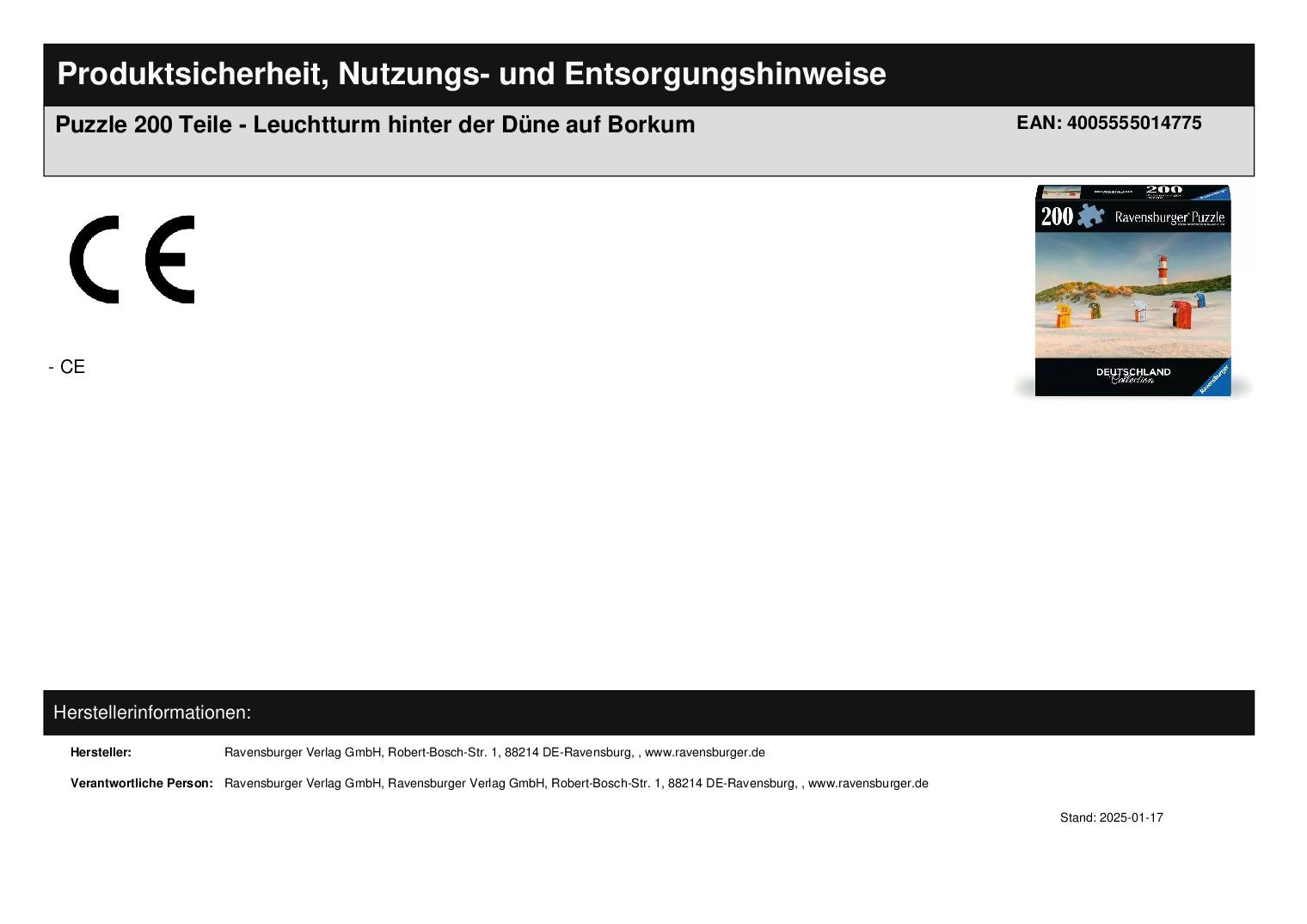 Deutschland von seiner schönsten Seite entdecken. Bezaubernde Landschaften, historische Städte, bekannten Sehenswürdigkeiten. Ravensburger Puzzles bedeutet Puzzlespaß in Premium Qualität. Puzzleteile, charakteristisch und einzigartig durch von Hand gefertigte Stanzwerkzeuge. Die jahrzehntelange Erfahrung in der Puzzleproduktion sowie den hohen Qualitätsanspruch lassen die Herzen der Puzzler höher schlagen und lässt erleben, wie eins zum andern passt. Hier wird Leidenschaft gelebt.