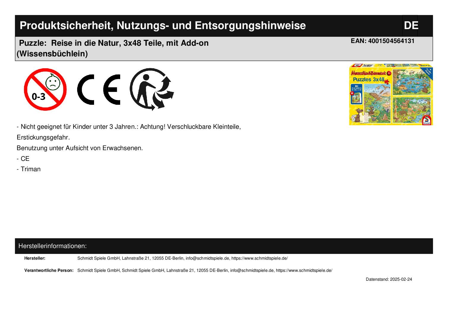 Produktinformationen "Puzzle: Reise in die Natur, 3x48 Teile, mit Add-on (Wissensbüchlein)"
