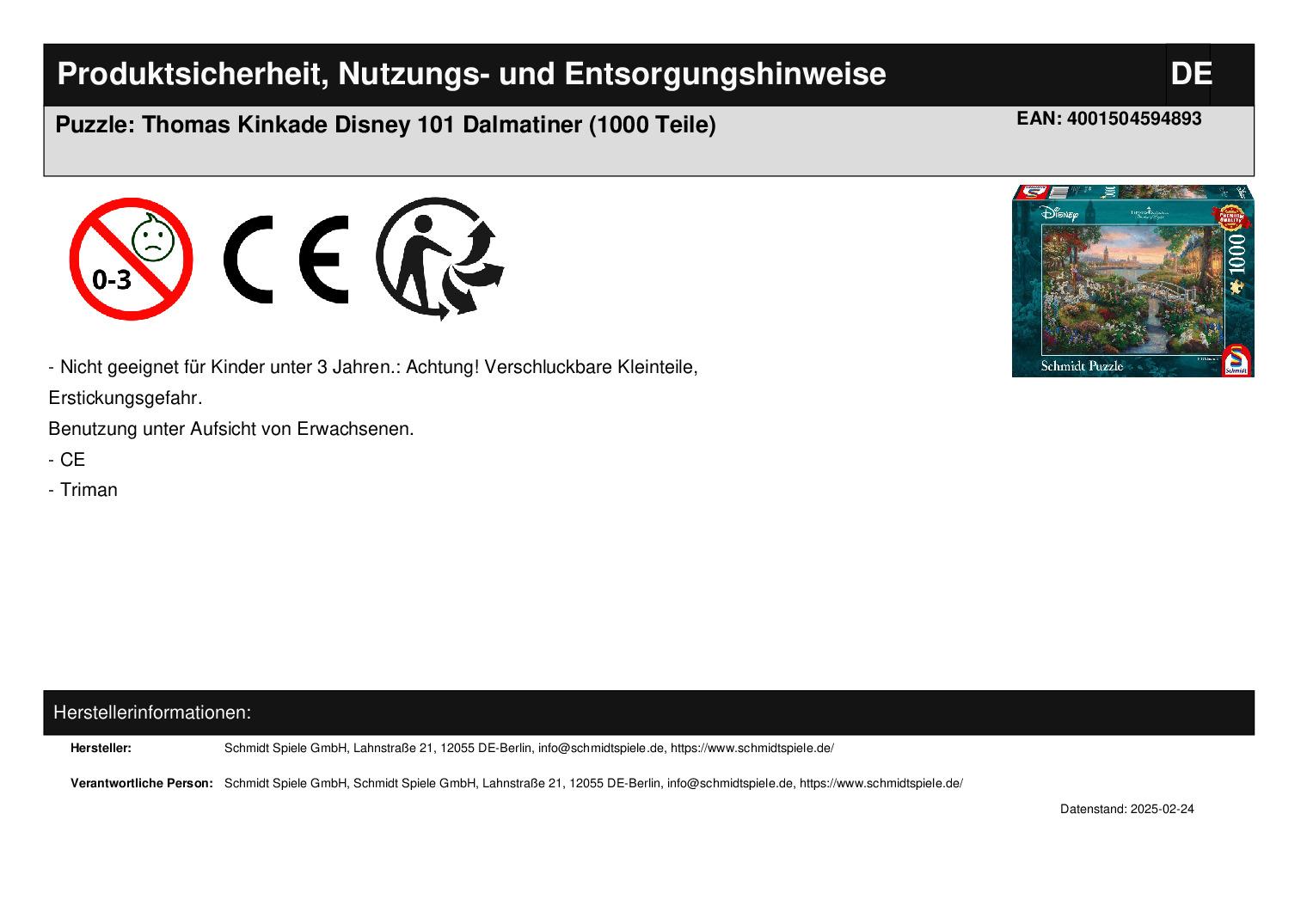 Thomas Kinkade, Disney, 101 Dalmatiner, 1000 Teile Puzzle. Wenn kleine Teile lange großes Vergnügen bieten sollen, sind bei deren Herstellung höchste Qualitätsanforderungen gefragt. Wir erfüllen diese und bezeichnen unsere Puzzles mit „Premium-Qualität. Dabei sichern systematische Kontrollen hochwertigste Rohstoffe, ren innovative Produktionsverfahren beste Machart, ermöglichen internationale Verbindungen exklusive Motive. Man sagt von ihm, er sei der Maler des Lichts gewesen, denn in seinen impressionistischen Gemälden spielt Licht die Hauptrolle – mal scheint es zwischen Bäumen hervor, mal spiegelt es sich in klarem Wasser eines Baches, mal lugt es in dunkler Nacht aus den Fenstern eines einsamen Hauses. Ob Gemälde, Textilien, Bücher, Puzzle – seine Kunstprodukte sollen den Menschen Hoffnung, Freude, Inspiration, Licht und den Blick für alles Schöne in der Welt schenken. Das Ergebnis: SCHMIDT SPIELE Premium-Puzzles - mit Qualität, die Sie greifen können. Perfekter Zusammenhalt durch speziell entwickelte Pappe. Perfekte Passgenauigkeit durch besonders feine Stanzmesser. Große Formenvielfalt durch individuell geformte Puzzleteile. Leinenstruktur. Spezieller Mattlack für spiegelfreies Puzzeln. Exklusives Design.