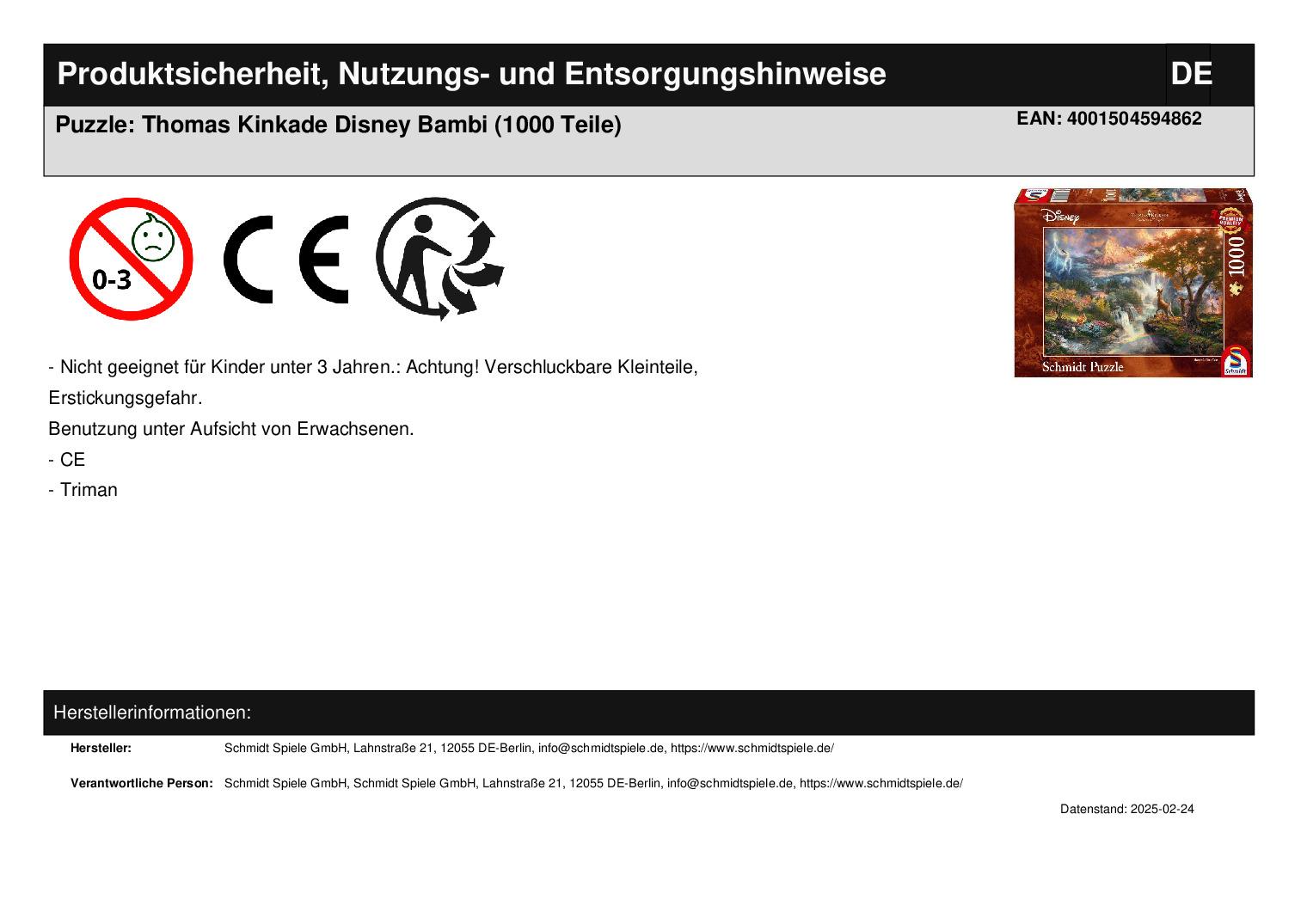 Thomas Kinkade, Disney Bambi, 1000 Teile Puzzle. Wenn kleine Teile lange großes Vergnügen bieten sollen, sind bei deren Herstellung höchste Qualitätsanforderungen gefragt. Wir erfüllen diese und bezeichnen unsere Puzzles mit „Premium-Qualität. Dabei sichern systematische Kontrollen hochwertigste Rohstoffe, garantieren innovative Produktionsverfahren beste Machart, ermöglichen internationale Verbindungen exklusive Motive. Das Ergebnis: SCHMIDT SPIELE Premium-Puzzles - mit Qualität, die Sie greifen können. Perfekter Zusammenhalt durch speziell entwickelte Pappe. Perfekte Passgenauigkeit durch besonders feine Stanzmesser. Große Formenvielfalt durch individuell geformte Puzzleteile. Leinenstruktur. Spezieller Mattlack für spiegelfreies Puzzeln. Exklusives Design.