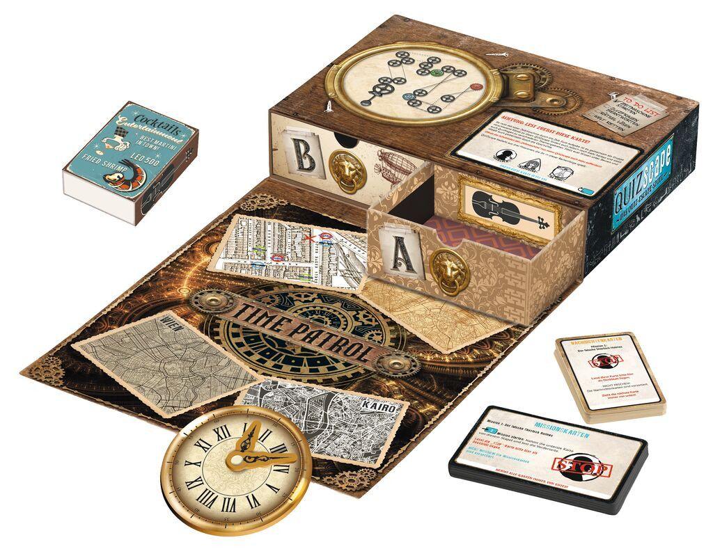 Eine Schachtel voller Überraschungen, drei spannende Zeitreise-Abenteuer und eine einzigartige Kombination aus Quizfragen und Escape-Feeling – das ist QUIZscape. Das neuartige Spielkonzept ist perfekt für Einsteiger geeignet und ermöglicht einen schnellen Spieleinstieg. Anders als bei anderen Escape-Games lässt sich das Spiel komplett in den Ursprungszustand zurücksetzen, das gesamte Material bleibt unversehrt.