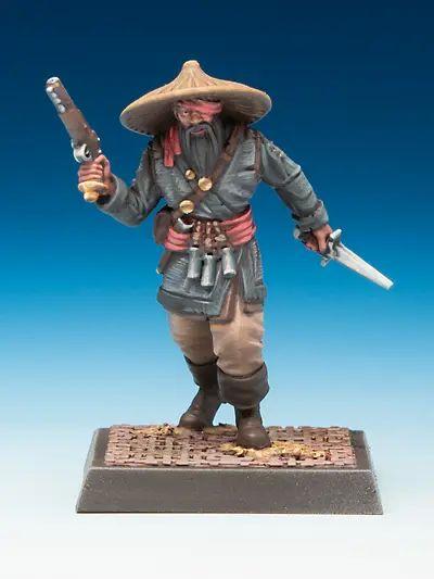 Der Figur liegt die Charakterkarte mit allen für Freebooter’s Fate benötigten Spielwerten bei. Die Metallfigur wird unbemalt und in Einzelteilen geliefert und muss noch zusammengebaut werden.