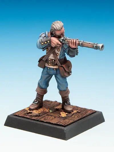 Der Figur liegen die Charakterkarten mit allen für Freebooter’s Fate benötigten Spielwerten bei. Die Metall-Figur wird unbemalt und in Einzelteilen geliefert und muss noch zusammengebaut werden.