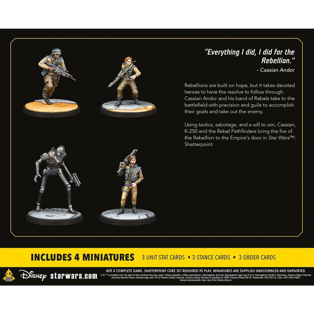 Der Squad-Pack „Ihr könnt euch auf mich verlassen” beinhaltet Cassian Endor, K-2S0 und zwei Rebellen-Pfadfinder zum Erstellen eines Einsatzteams für das Skirmish-Miniaturenspiel Star Wars™: Shatterpoint.