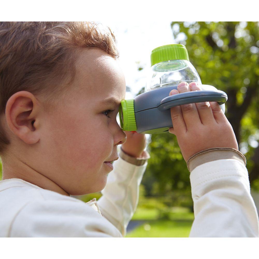 Damit können junge Forscher Käfer, Spinnen, Schneckenhäuser, Steinchen und andere Fundsachen aus der Natur ganz genau unter die Lupe nehmen. Das Besondere ist der raffinierte Spiegelmechanismus, mit dem Objekte zugleich von oben und unten beobachtet werden können. Die Lupe vergrößert oben 6-fach und unten 4-fach. Dank 2 Griffen gut zu greifen. Mit Nylon-Schlaufe und Alu-Karabiner. Inkl. Kunststoffspinne.