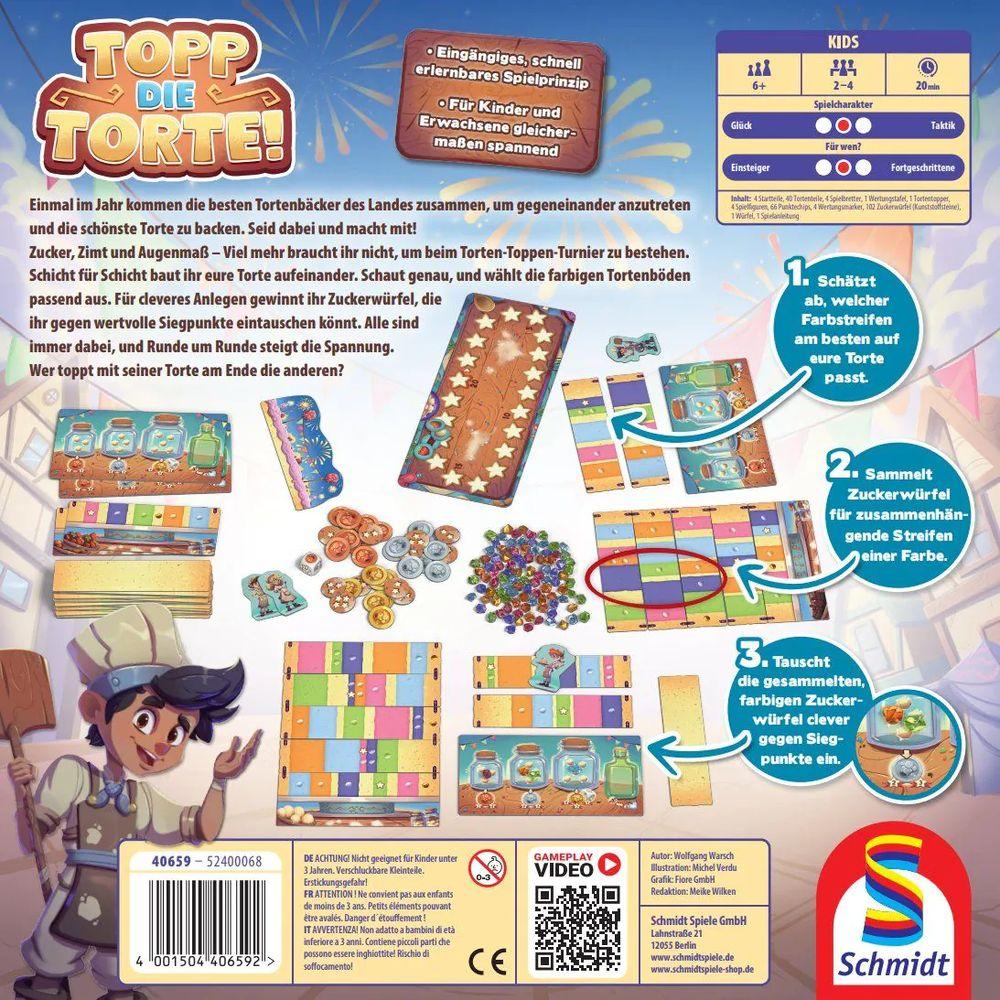 Für cleveres Anlegen gewinnt ihr Zuckerwürfel, die ihr gegen wertvolle Siegpunkte eintauschen könnt. Alle sind immer dabei, und Runde um Runde steigt die Spannung. Wer toppt mit seiner Torte am Ende die anderen?