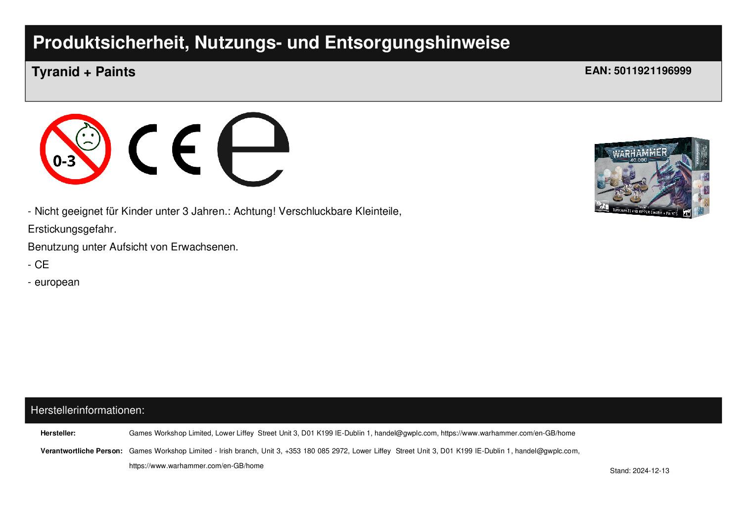 Games Workshop Limited Lower Liffey Street Unit 3 D01 K199 Dublin 1 handel@gwplc.com https://www.warhammer.com/en-GB/home WEEE-Nummer: