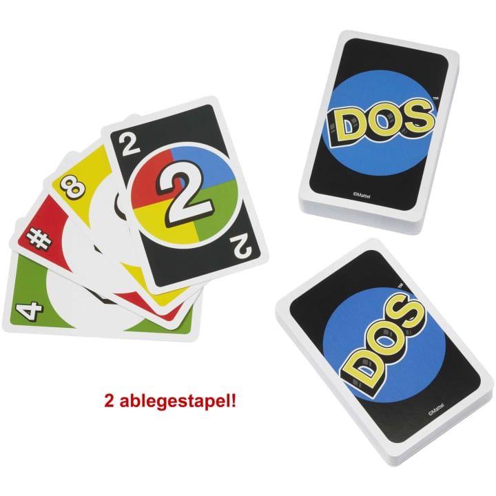 UNO hat jetzt einen neuen besten Freund: DOS! Bei diesem lustigen Kartenspiel sind zwei Karten besser als eine und passende Zahlen geben Punkte! Genau wie bei UNO, ist auch bei DOS Ziel des Spiels, als Erster Spieler alle Karten abzulegen. Zu Beginn werden zwei Ablegestapel zwischen den Spielern platziert. Ist ein Spieler am Zug, kann er entweder eine oder zwei Karten auf einen Ablegestapel legen. Wenn ein Spieler also zwei Karten hat, die zusammen die Zahl auf der Karte eines Ablegestapels ergeben, darf er BEIDE Karten ablegen. ... AUF EINEN DER BEIDEN ABLEGESTAPEL LEGEN.... Wer nur noch zwei Karten auf der Hand hat, muss DOS!“ rufen. Wer als Erster 200 Punkte erreicht, gewinnt! Das Spiel enthält 112 Karten sowie eine Anleitung. Für 2 bis 4 Spieler. Ab 7 Jahren. Abweichungen in Farbe und Gestaltung vorbehalten.