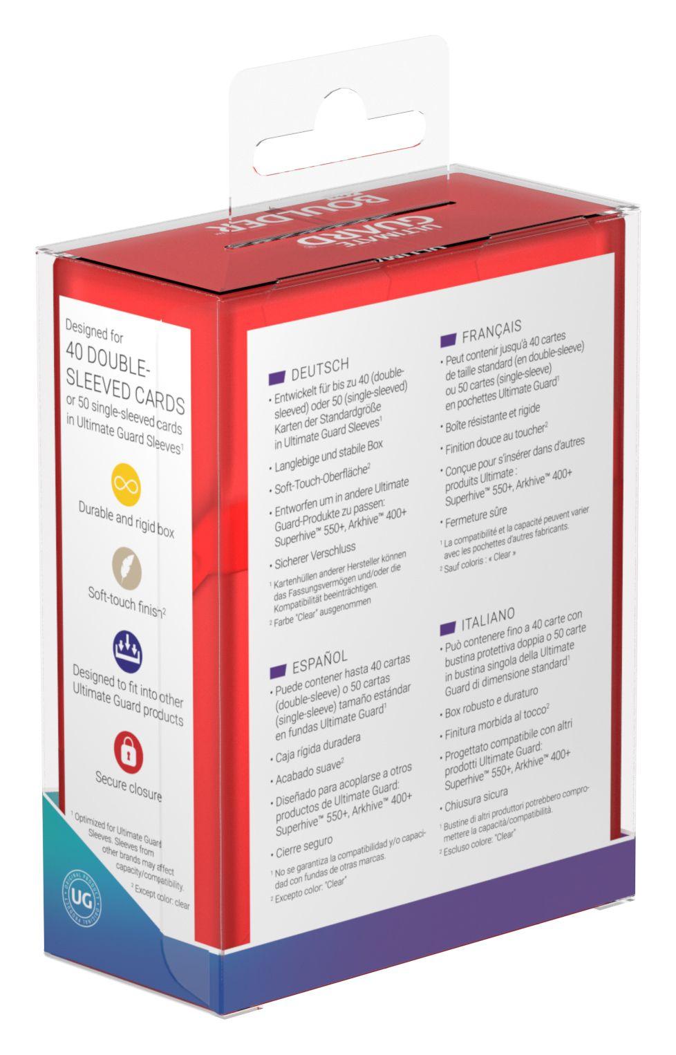 - Designed für bis zu 40 (double-sleeved) oder 50 (single-sleeved) Karten der Standardgröße in Ultimate Guard Sleeves