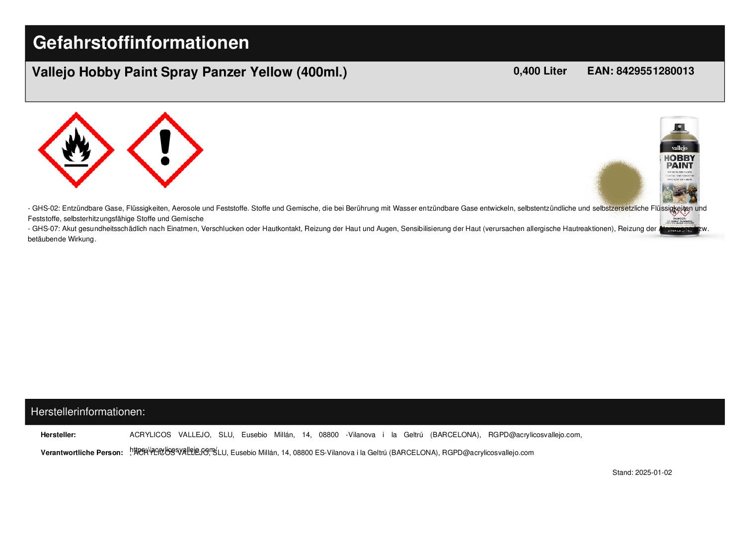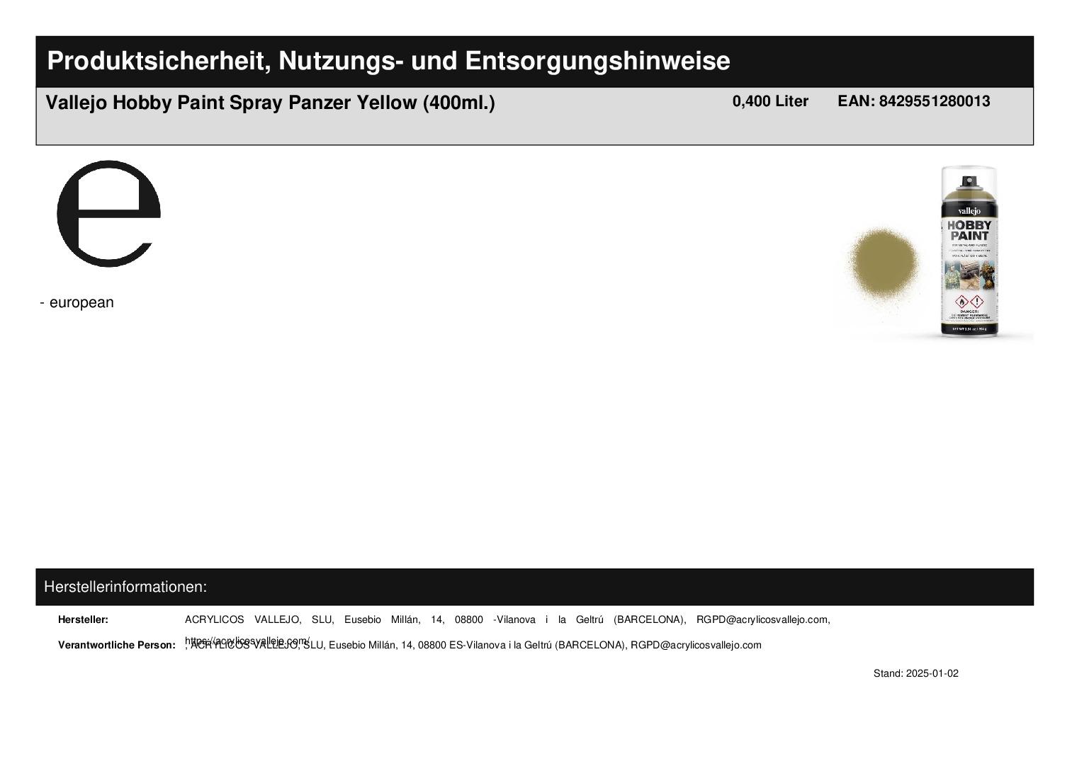 Produktinformationen "Vallejo Hobby Paint Spray Panzer Yellow (400ml.)"