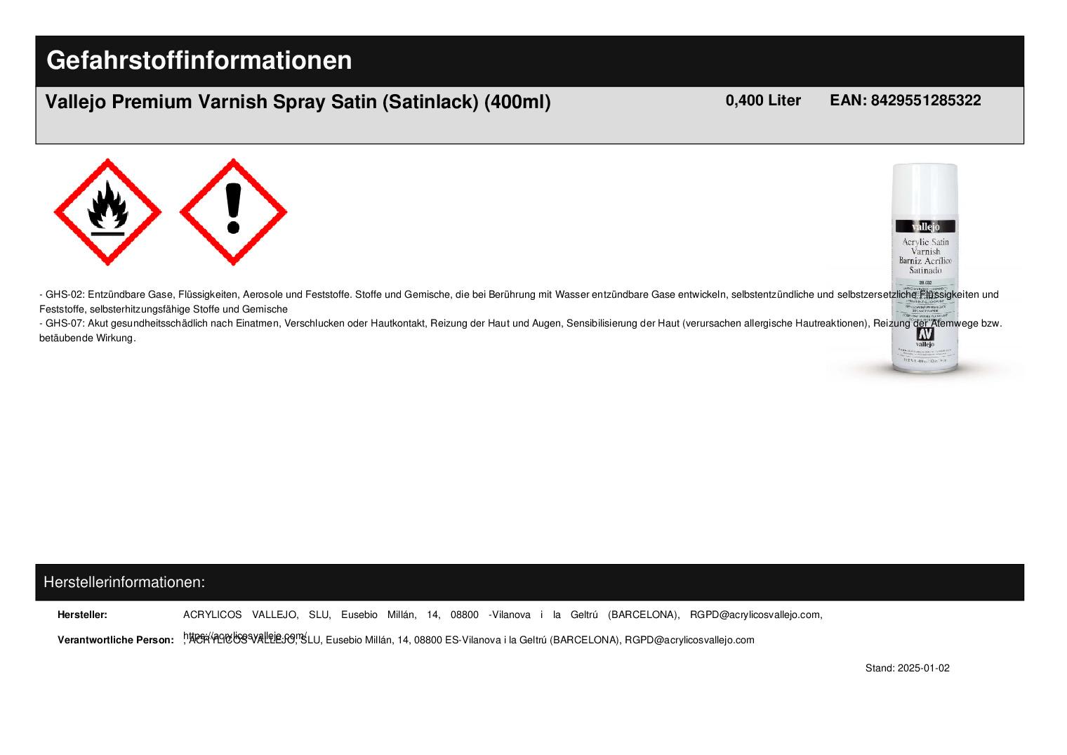 Produktinformationen "Vallejo Premium Varnish Spray Satin (Satinlack) (400ml)"