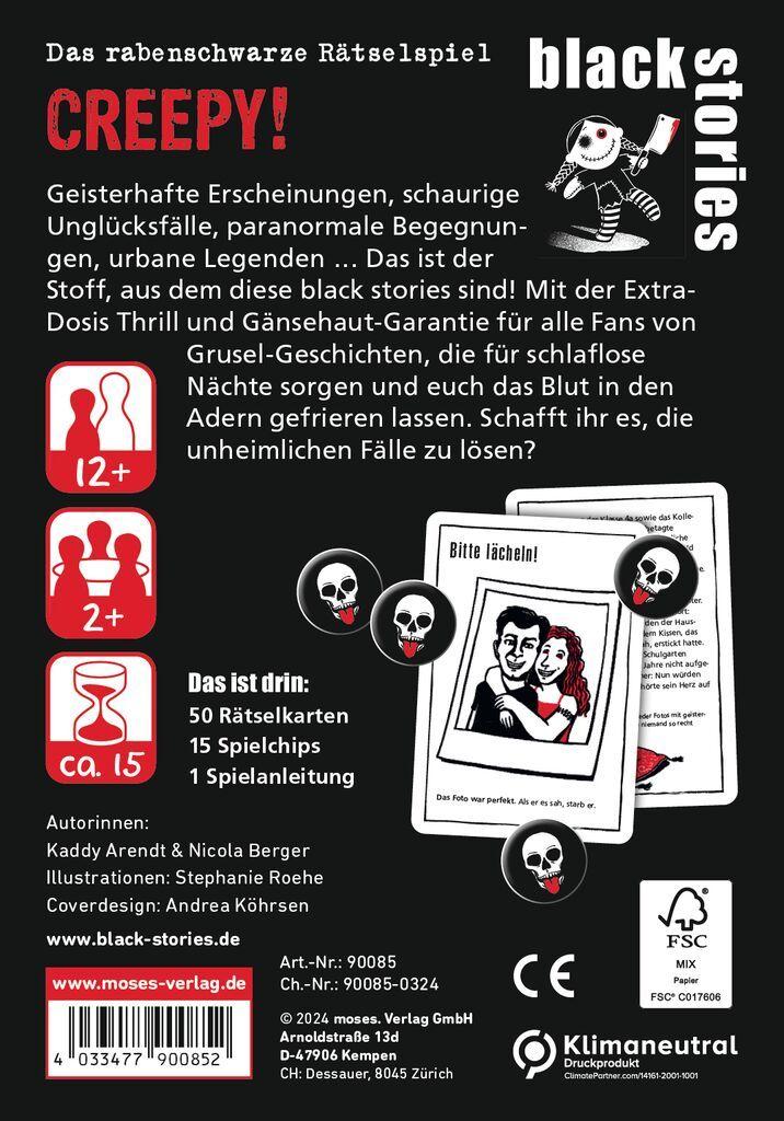 black stories Creepy! sorgt für die Extra Dosis Thrill und Gänsehaut ein Muss für Grusel-Fans. In dem spannenden Spiel warten 50 Fälle rund um geisterhafte Erscheinungen und paranormale Begegnungen, die einem das Blut in den Adern gefrieren lassen, darauf gelöst zu werden. black stories Creepy! Ist ideal geeignet für alle Fans von urbanen Legenden, die es ein bisschen schauriger mögen.