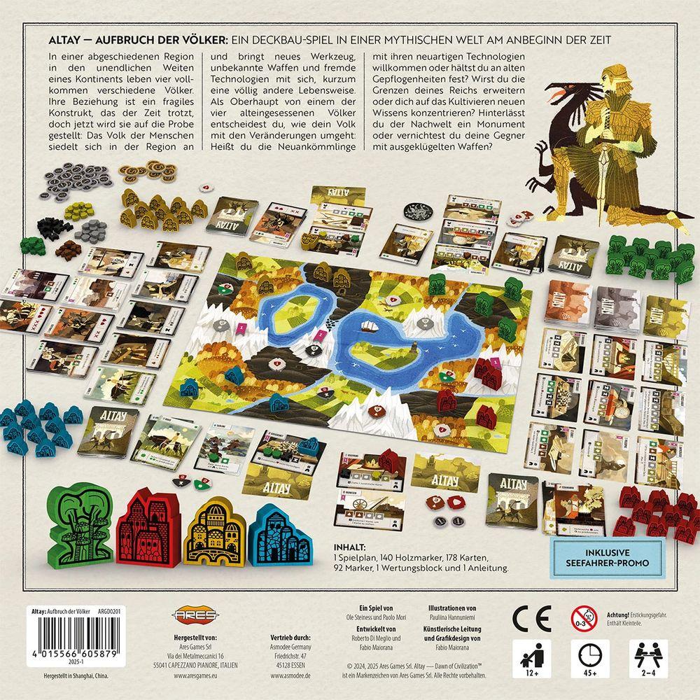 Altay: Aufbruch der Völker ist ein strategisches Zivilisationsspiel für 2–4 Spieler ab 12 Jahren. Es kombiniert Deck-Building, Ressourcenmanagement und Area-Control in einer mythischen Welt. Jede Fraktion verfügt über ein individuelles Starterdeck und verfolgt eigene Strategien, um durch Expansion, Technologie und kulturelle Leistungen den Sieg zu erringen.