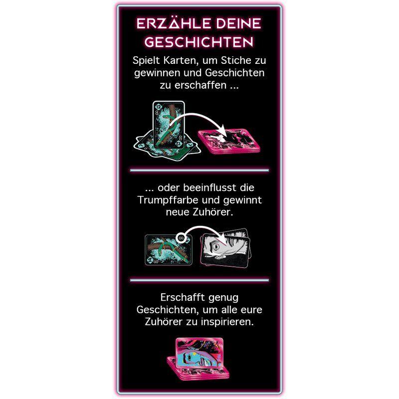 In diesem Kartenspiel von Cyril Blondel und Jim Dratwa solltet ihr euch gut überlegen, welchen Stich ihr machen wollt! Jeder Stich-Stapel steht für eine Geschichte, aber Geschichten, die nicht erzählt werden, sind nur wenig wert. Könnt ihr Zuhörer gewinnen - indem ihr eine Karte nicht in den Stich spielt, sondern für ihre angegebene Anzahl an Zuhörern ausspielt - könnt ihr jedem Zuhörern eine eurer Geschichte erzählen, um ihn zu inspirieren. Es sollte immer euer Ziel sein, all eure Zuhörer zu inspirieren, denn das verschafft euch die Gunst des Tricksters Anansi und damit Bonuspunkte.
