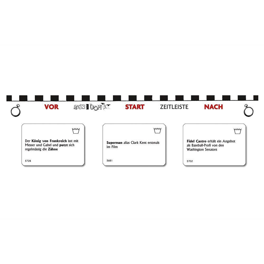 So fügt reihum jeder Spieler der Kette mit den Ereignissen ein neues hinzu, bis ein Mitspieler seine Zweifel äußert und die Kette überprüft wird. Wer falsch lag, bekommt nun Strafkarten vom Stapel, die er ebenfalls wieder loswerden muss. ... und schon wachsen mit der nächsten Ereigniskette die Zweifel der Mitspieler heran. Das einfache Spielprinzip und die kuriosen Ereignisse garantieren einen lange anhaltenden und immer abwechslungsreichen Spielspaß! Die Serien sind nach Themengebieten sortiert, bei den einzelnen Themen ist der Rahmen jedoch weit gesteckt. Natürlich kann jede Serie für sich allein gespielt werden. Das Spiel entfaltet aber einen zusätzlichen Reiz, wenn man die Serien mischt.