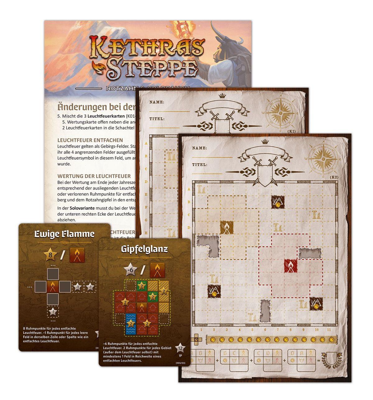 Kethras Steppe – Rotzahn & Goldbauch: Über dem Grasland von Kethras Steppe erheben sich die Zwillingstürme auf dem Rotzahngipfel und dem Goldbauchberg. Die Spielenden müssen nicht nur das Terrain kartographieren, sondern auch die mysteriösen Leuchtfeuer der beiden Türme neu entfachen. Diese Feuer repräsentieren die Augen von Kethra, der Göttin der Tore und Pforten. Königin Gimnax hofft darauf, auf diese Weise die Gunst der Göttin zu gewinnen und so Portale zu anderen Welten zu öffnen.