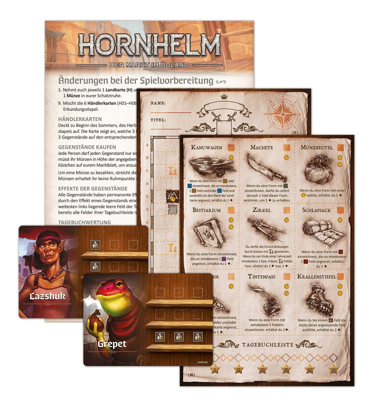 Hornhelm – Der Markt im Ödland: Handelsvolk aus allen Regionen von Ulos zieht es zum legendären Markt von Hornhelm, um dort allerlei Waren feilzubieten. Feine Stoffe, aromatische Gewürze und eindrucksvolle Handwerkswaren schmücken die zahlreichen Auslagen. Für die Kartograph*innen sind besonders jene Angebote interessant, die die mühsame Arbeit des Kartographierens zu beschleunigen oder die Genauigkeit der Landkarten zu verbessern vermögen. Am Ende jeder Jahreszeit haben sie die Möglichkeit, ihre gesammelten Goldmünzen auszugeben, um damit Waren vom Markt zu kaufen.