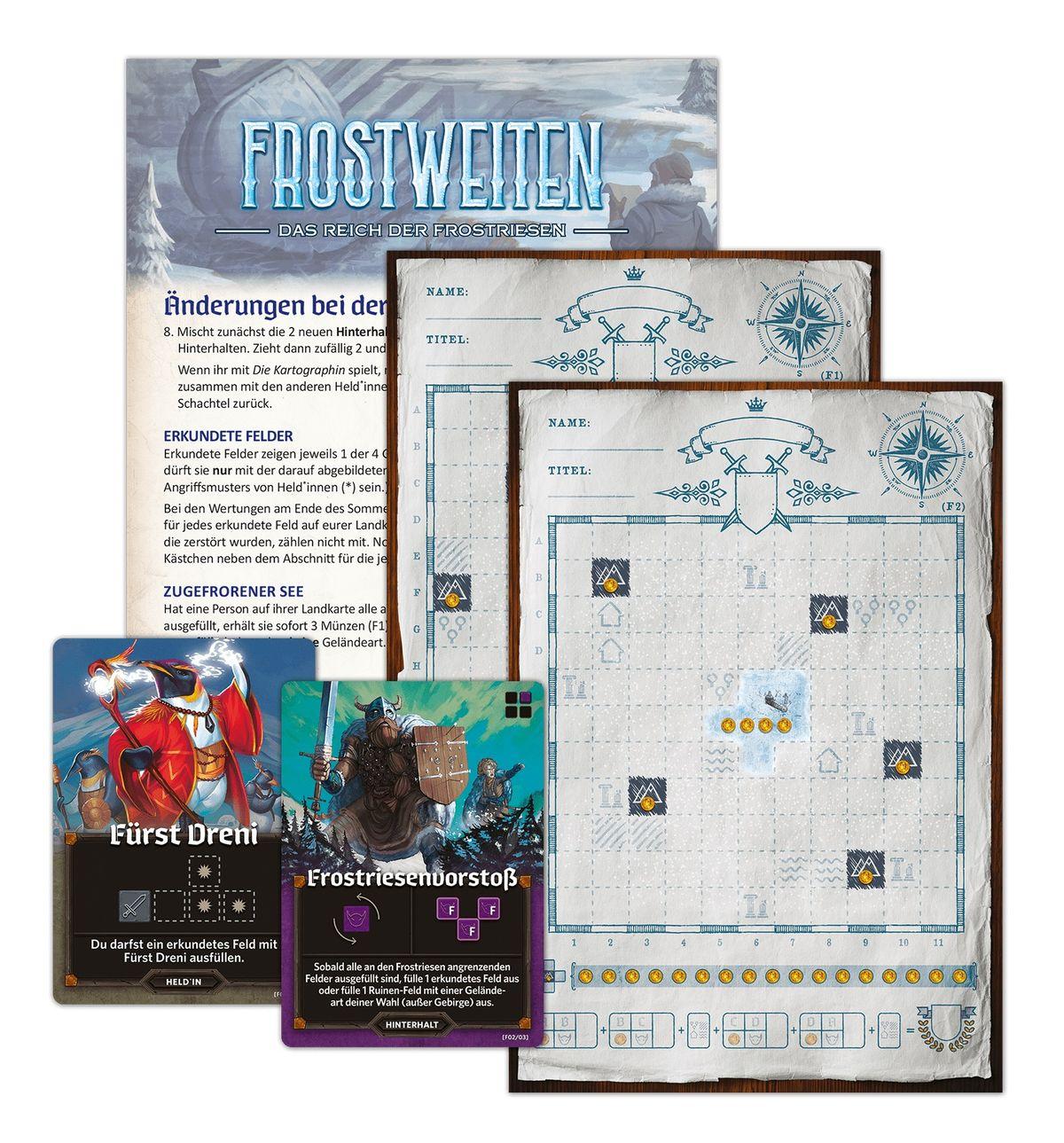 Frostweiten – Das Reich der Frostriesen: Eisige Winde wehen über die verschneite Ödnis, welche sowohl die Kaiika als auch die fürchterlichen Frostriesen ihr zuhause nennen. Nur ein paar Kartenfetzen sind erhalten von der letzten Expedition, die hier ihr Glück versuchte. Diese dienen nun als erste Orientierung. So ist bereits zu Beginn des Spiels für einige Felder vorgegeben, welche Geländeart dort eingetragen werden muss. Wer zudem das gesamte Ufer des gefrorenen Sees kartographiert, kann einen wertvollen Schatz aus dessen Tiefen bergen.