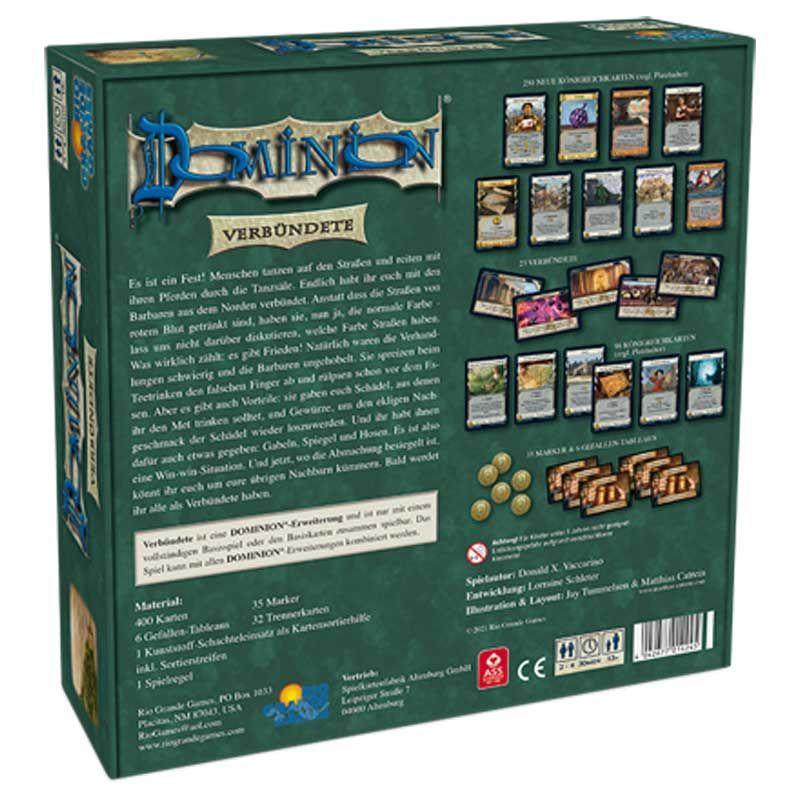 Es ist ein Fest! Menschen tanzen auf den Straßen und reiten mit ihren Pferden durch die Tanzsäle. Endlich habt ihr euch mit den Barbaren aus dem Norden verbündet. Anstatt dass die Straßen von rotem Blut getränkt sind, haben sie, nun ja, die normale Farbe – lass uns nicht darüber diskutieren, welche Farbe Straßen haben. Was wirklich zählt: es gibt Frieden! Natürlich waren die Verhandlungen schwierig und die Barbaren ungehobelt. Sie spreizen beim Teetrinken den falschen Finger ab und rülpsen schon vor dem Essen. Aber es gibt auch Vorteile: sie gaben euch Schädel, aus denen ihr den Met trinken solltet, und Gewürze, um den ekligen Nachgeschmack der Schädel wieder loszuwerden. Und ihr habt ihnen dafür auch etwas gegeben: Gabeln, Spiegel und Hosen. Es ist also eine Win-win-Situation. Und jetzt, wo die Abmachung besiegelt ist, könnt ihr euch um eure übrigen Nachbarn kümmern. Bald werdet ihr alle als Verbündete haben. Verbündete ist die 14. DOMINION®-Erweiterung und nur mit einem vollständigen Basisspiel oder den Basiskarten zusammen spielbar. Das Spiel kann mit allen DOMINION®-Erweiterungen kombiniert werden. Mit ihr kommen 400 neue Karten, darunter die neue Kartenart VERBÜNDETE - mit diesen kann man Gefallen, die ihr durch Königreichkarten erworben habt, einlösen. Außerdem enthalten sind Tableaus und Metallmarker, viele tolle und spannende neue Karten sowie Trenner für die separat erhältliche Sammlerbox.