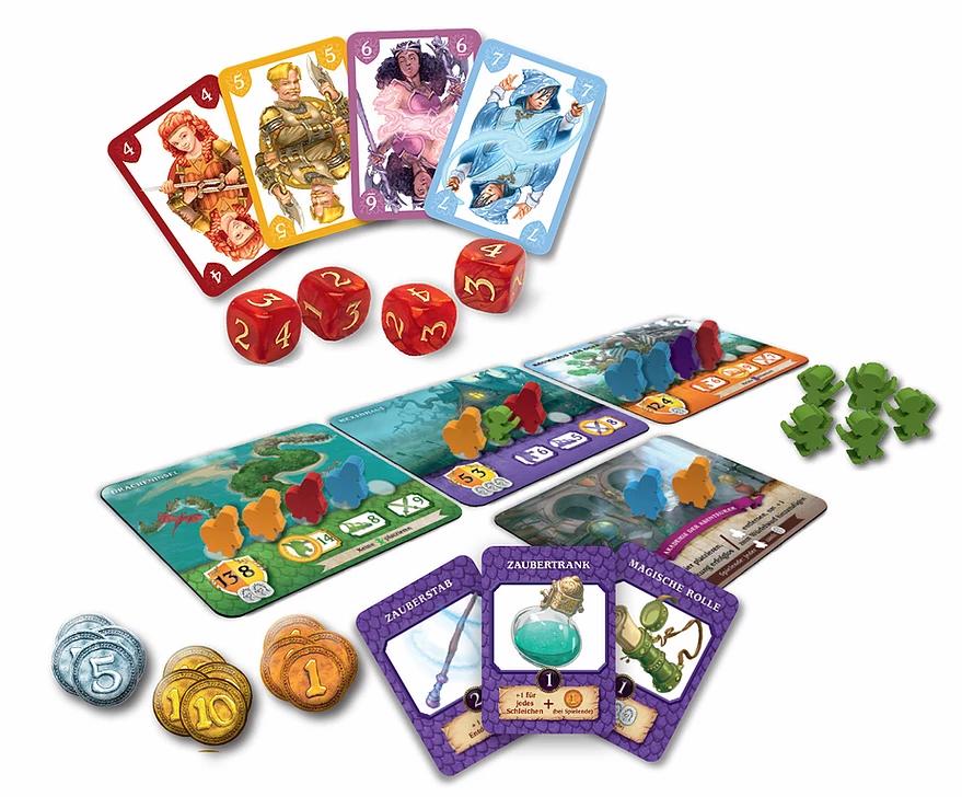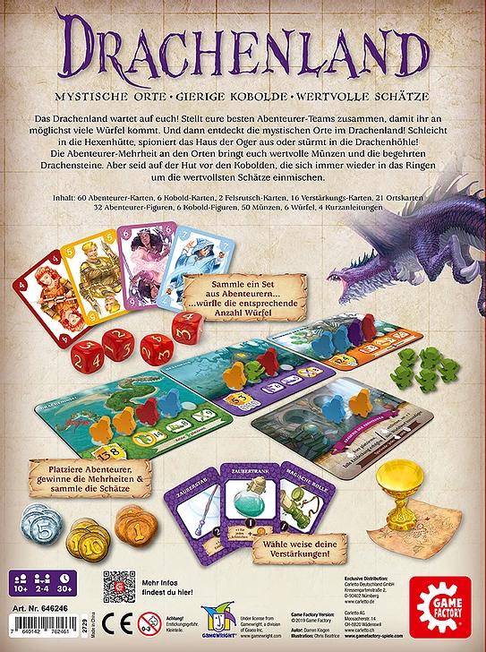 Stellt eure besten Abenteurer-Teams zusammen, damit ihr an möglichst viele Würfel kommt. Und dann entdeckt die mystischen Orte im Drachenland! Schleicht in die Hexenhütte, spioniert das Haus der Oger aus oder stürmt in die Drachenhöhle!