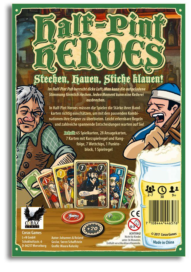 Half-Pint Heroes entführt euch in einen gemütlichen Pub, in dem die Gemüter kurz vor dem Überkochen sind. Also zieht euch warm an, nehmt Platz und schon kann es losgehen mit diesem Stichspiel der besonders spaßigen Art, in dem 2-7 Gelegenheits- oder Kennerspieler ab 9 Jahren sich ihre Köpfe zerbrechen werden... natürlich nur im übertragenen Sinn ;)