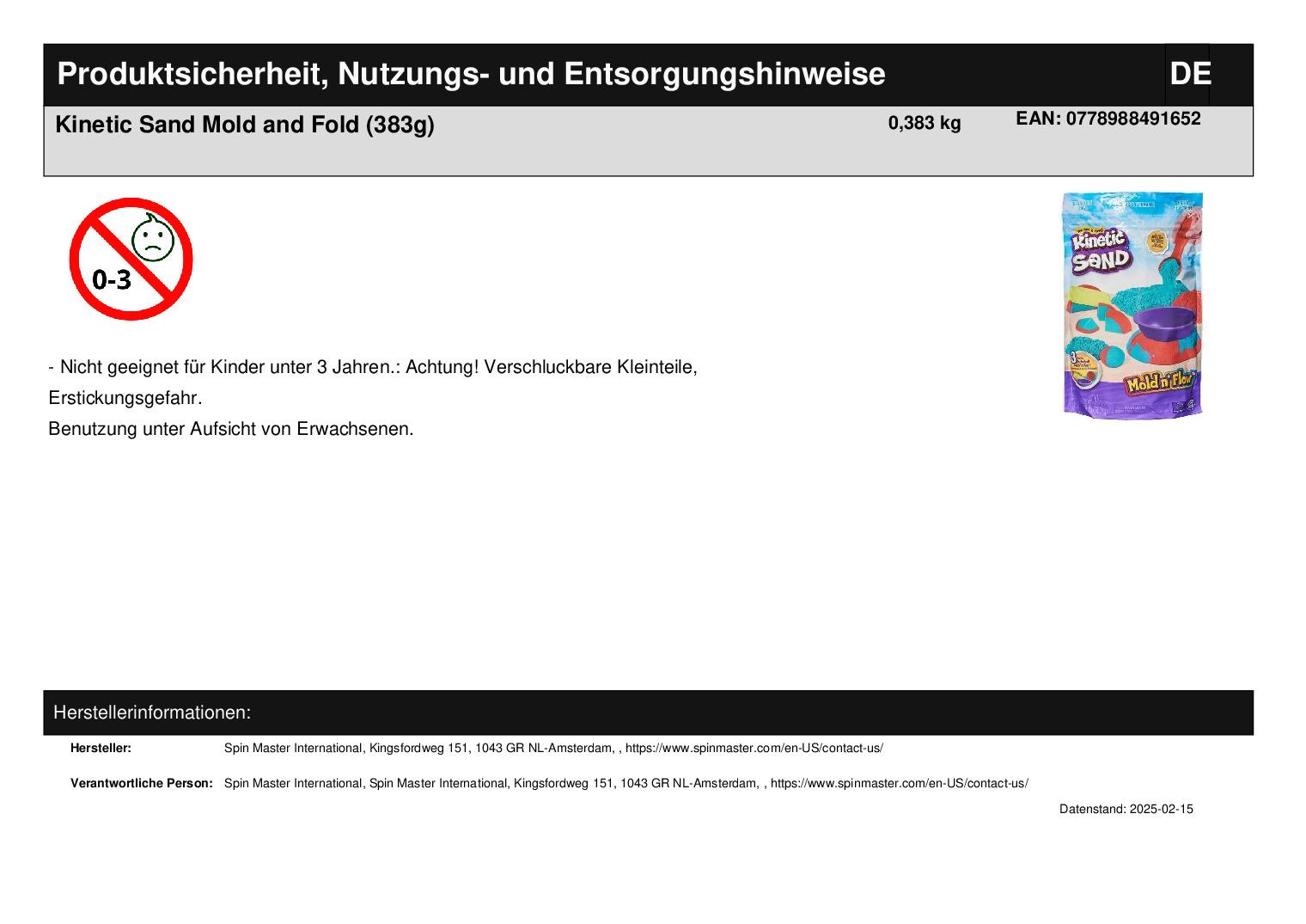 Natürlich dürfen auch Accessoires aus anderen Kinetic Sand Sets oder Haushaltsgegenstände zum Einsatz kommen. Kinetic Sand haftet wie von Zauberhand an sich selbst und lässt sich daher nach dem Spielen auch leicht aufräumen. Einfach eine Kugel aus Kinetic Sand formen und Reste damit auftupfen. Sand und Zubehörteile können in dem wiederverschließbaren Verpackungsbeutel aufbewahrt werden. Seine optimale Konsistenz besitzt Kinetic Sand bei etwa 60% Luftfeuchtigkeit. Sollte die Raumluft zu trocken sein, den Sand einfach mit etwas Wasser besprühen oder ein paar Tropfen Wasser unterkneten.