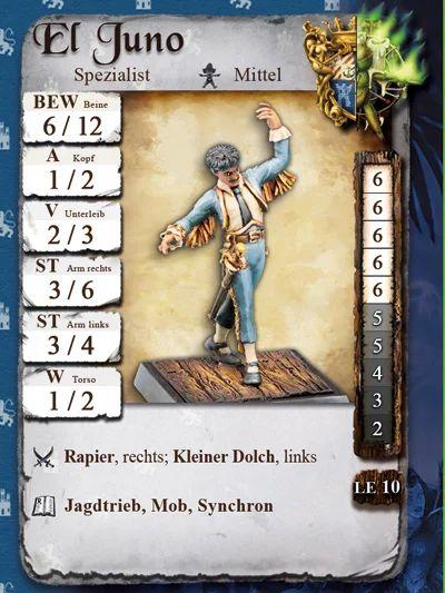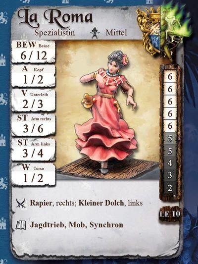 Erstaunlich schnell bewegen sich La Roma und El Juno tänzelnd über das Schlachtfeld. Sie sind sehr gut aufeinander eingespielt. Einzeln sind sie schwach, doch zusammen kommen ihre Eigenschaften voll zum Tragen: +1A und Rüstungsbrechend mit Jagdtrieb, +1 /+1 ST bei einer Unterstützung mit Mob, und on Top können sie direkt nacheinander handeln. Unbedingt ausprobieren!