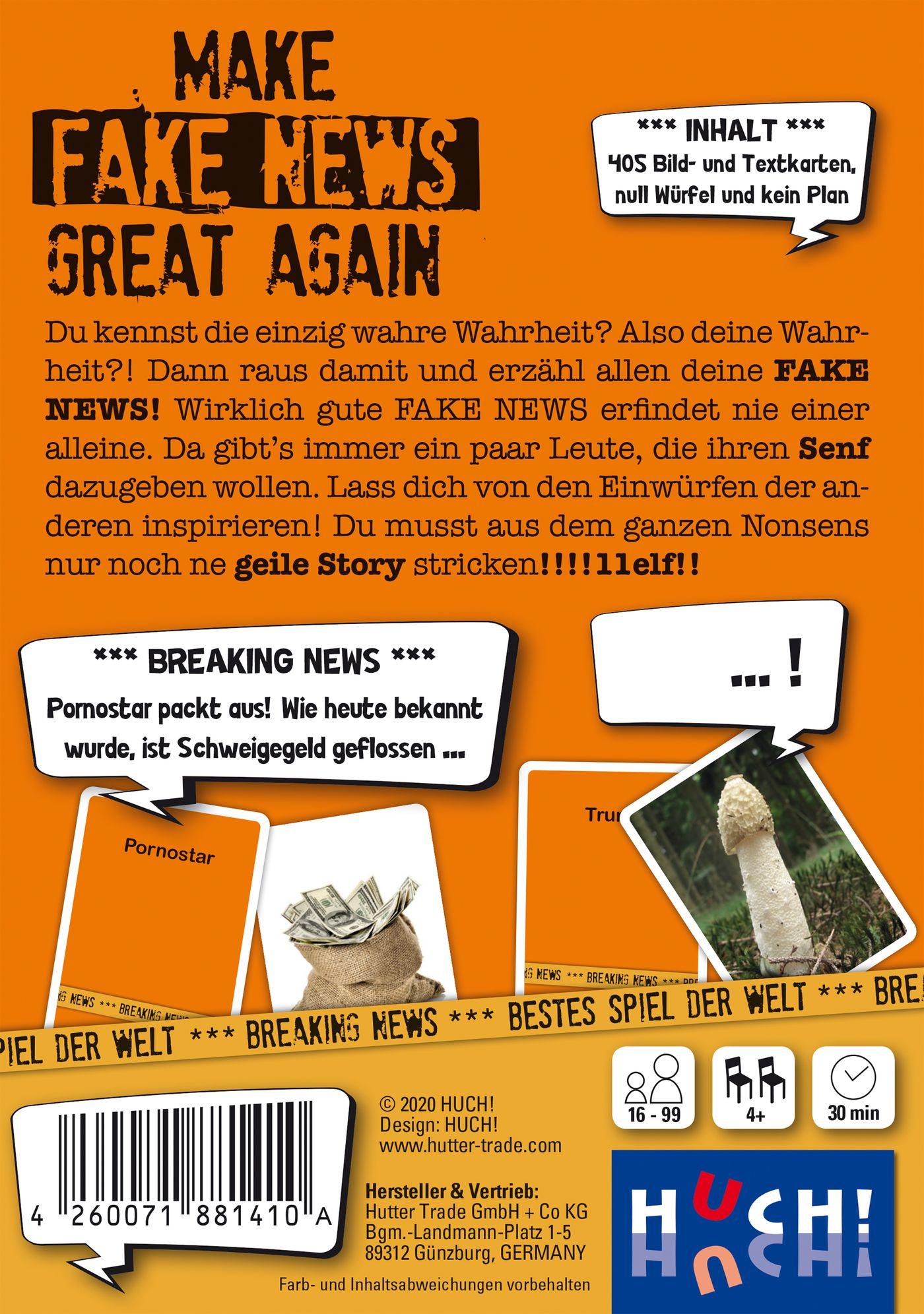 Das freche Kommunikationsspiel „Make Fake News Great Again“ kitzelt witzige und schräge Geschichten aus dir heraus, lockert jede Stimmung und sollte bei keiner Party fehlen. Nichts als die Wahrheit, oder?!