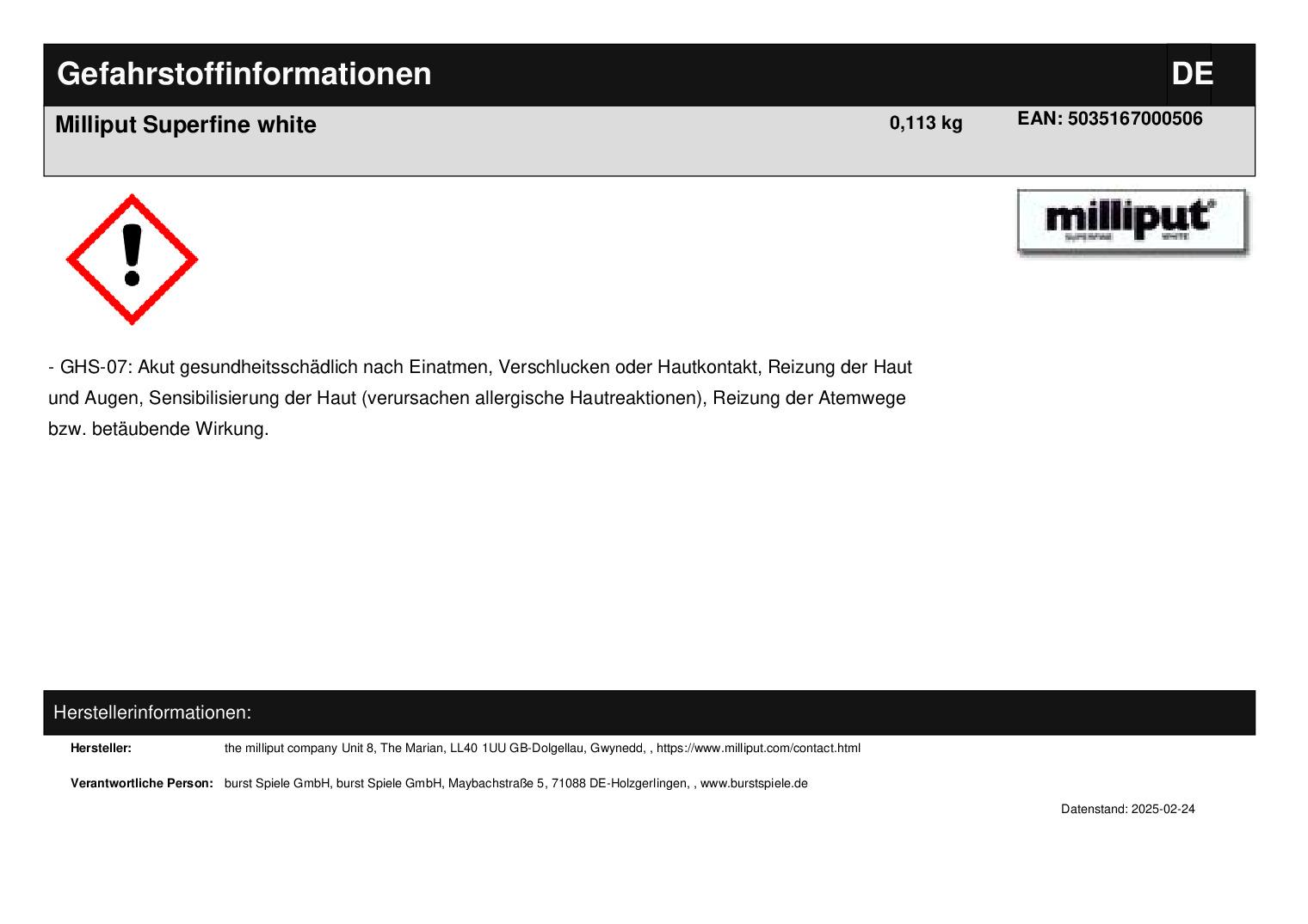 the milliput company Unit 8 The Marian LL40 1UU Dolgellau, Gwynedd https://www.milliput.com/contact.html WEEE-Nummer: