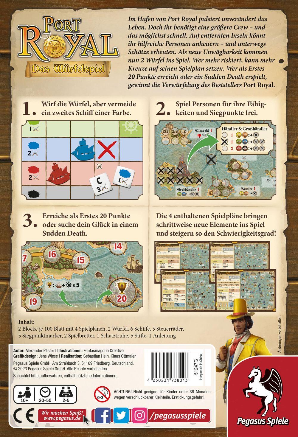 Der Karibik-Klassiker mit Piratenflair ist zurück! In Port Royal – Das Würfelspiel tauschen die Spielenden nun Karten gegen Würfel und Stifte. Das Ziel bleibt jedoch identisch: eine schlagkräftige Crew zusammenzustellen und mit ihr die weite See für sich zu gewinnen. Wer es auf eine der Inseln schafft, kann dort neue Crew-Mitglieder anheuern und mit ihnen wertvolle Fähigkeiten dazu gewinnen. Aber Vorsicht, wer zu hoch pokert, bekommt eine ordentliche Prise Gegenwind!